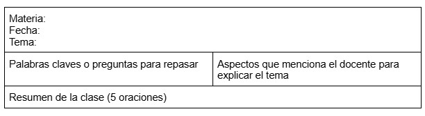 - Después de la clase: Al día siguiente, revisá tus apuntes. Completá lo que falte y escribí el resumen de abajo. Si tenés dudas, preguntale al profe o buscá en un libro o video.